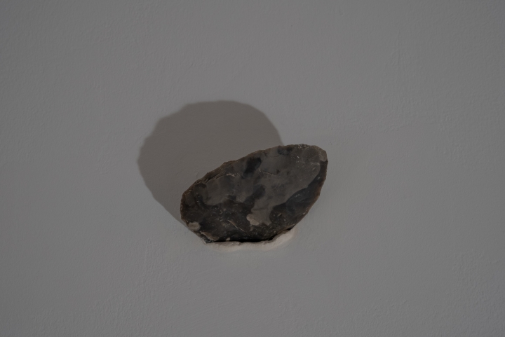 The hand axe was both the longest-used tool in human history and perhaps the first general-purpose device. Flint knapping of stone tools has been studied by archeologists to try to understand the cognitive capabilities of early humans and human ancestors by trying to understand the “grammar” of the tool production. In the exhibition, it was installed directly in the wall. I worked with an experimental archaeologist to produce the object.