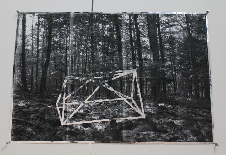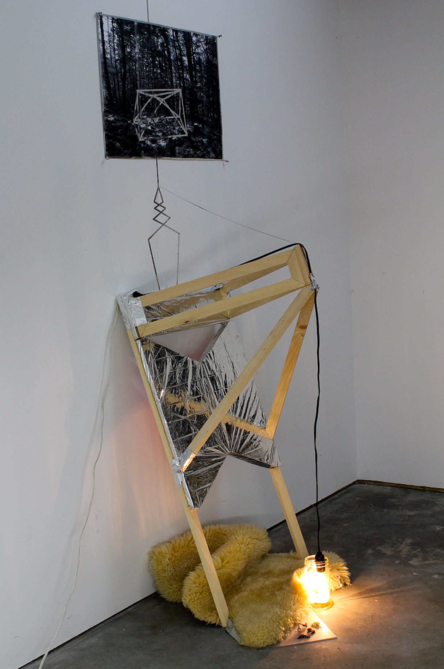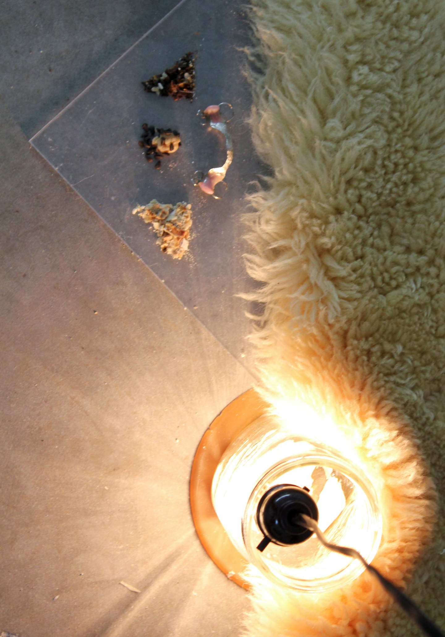 Goat milk, sheep skin, display light, Mason freezer jar, latex, morning glory seeds, dental bridge, acrylic sheet, mylar tape on laser prints, mylar tape, emergency blanket, wood, foam